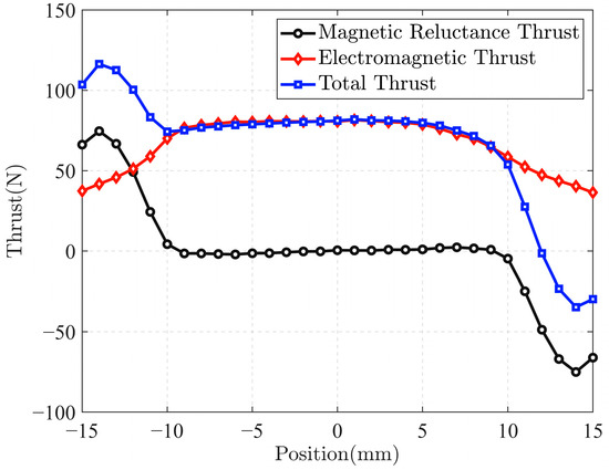 According to Equation (11), it can be inferred that at the initial position (the equilibrium position), the electromagnetic thrust of the motor is primarily influenced by the main magnetic flux of the excitation magnetic field, the number of turns per pole in the winding, and the number of stator teeth. The thrust of the PMLOM consists of both electromagnetic thrust and magnetic reluctance thrust. Given the characteristics of the PMLOM, which operates with high-frequency, short-stroke reciprocating motion, it is essential to minimize total thrust fluctuations and enhance the average thrust within the effective stroke range. This approach facilitates the precise control of the stroke and improves the stability of output thrust [15]. The average thrust within the effective stroke range is denoted as , while the maximum and minimum thrust values within this range are represented as and , respectively. The thrust fluctuation is indicated as .
