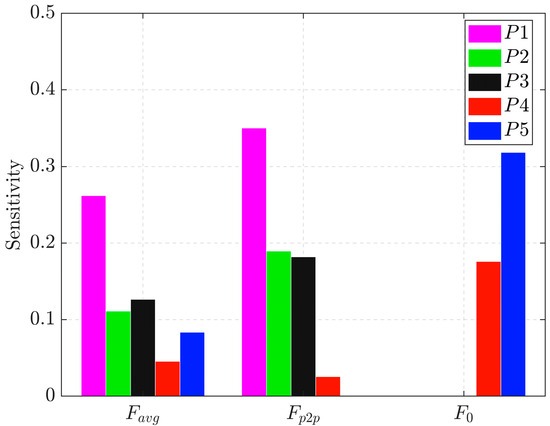 Sensitivity analysis is primarily employed to assess the degree to which input parameters influence output (response) by examining the optimization range of these parameters. This analysis facilitates the identification of parameters that significantly impact motor performance, enabling more targeted adjustments in the optimization design to enhance both its efficiency and effectiveness. Figure 7 displays the results of the parameter sensitivity analysis; the vertical axis of the sensitivity analysis graph is dimensionless and represents the correlation between input variables and the response, with the magnitude of the values reflecting the strength of this correlation. All input parameters influence the average thrust within the effective stroke range, whereas parameters and have comparatively minor effects. Thrust fluctuations are similar to the average thrust ; and exhibit a comparatively smaller impact. In contrast, the initial thrust is primarily determined by the input parameters and . Furthermore, we performed a construction analysis of the output response surface for the two input parameters that substantially influence the sensitivity of each output parameter, aiming to elucidate the trend in the primary input parameters in terms of the output objectives.