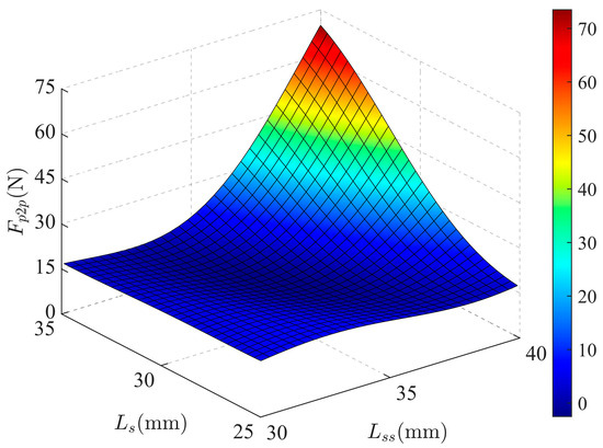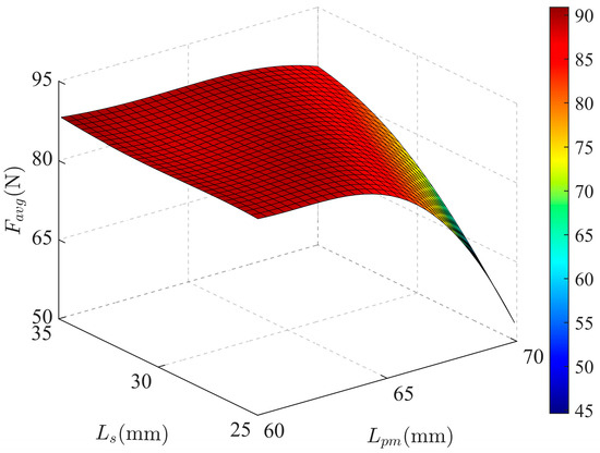 Figure 8 depicts the response surface of average thrust within the effective stroke range as it varies with the axial lengths of the outer stator and the mover’s permanent magnet . The analysis of the charts reveals that when the axial length of the permanent magnet is large and the axial length of the outer stator is small, the average thrust within the effective stroke decreases. Conversely, when the axial length of the permanent magnet is small and the axial length of the outer stator is large, saturation occurs. Figure 9 illustrates the response surface depicting thrust fluctuations . When both the spacing between the two outer stators and the outer stator length are large, thrust fluctuations increase significantly. As these parameters decrease, the overall trend reflects a reduction, although local extrema persist. Figure 10 presents the response surface of the initial thrust . This figure demonstrates that the initial thrust varies linearly with both the outer arc radius of the permanent magnet and the permanent magnet mechanical pole arc coefficient . Consequently, preliminary parameters can be determined based on the initial thrust using the formulas derived from the magnetic circuit law. Nevertheless, considering the characteristics of thrust within the effective stroke range, a multi-objective optimization algorithm remains necessary.