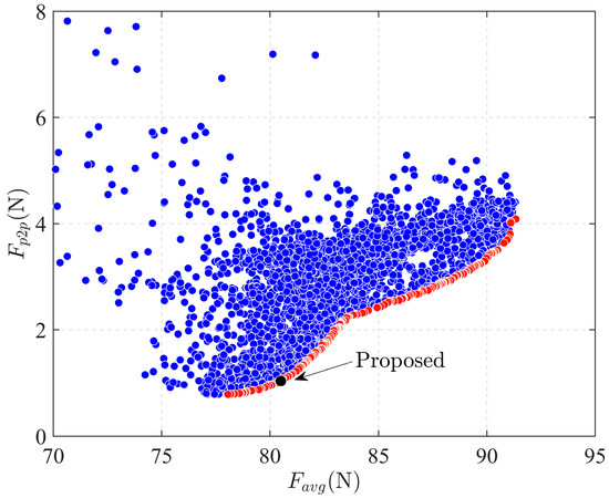 As shown in Figure 6, the three-dimensional electromagnetic finite element model, constructed using the motor’s initial parameters, reveals that the electromagnetic thrust at the equilibrium position is 81.12 N, with a deviation of 2.31% from the results obtained using the magnetic circuit method. Consequently, the simplified magnetic circuit method described previously can be utilized for the rapid calculation of the initial parameters. The Ansys electromagnetic finite element model, developed from the initial parameters derived from the magnetic circuit method, is further subjected to the multi-objective optimization of the motor’s thrust characteristics through Ansys OptiLang 2021R1.