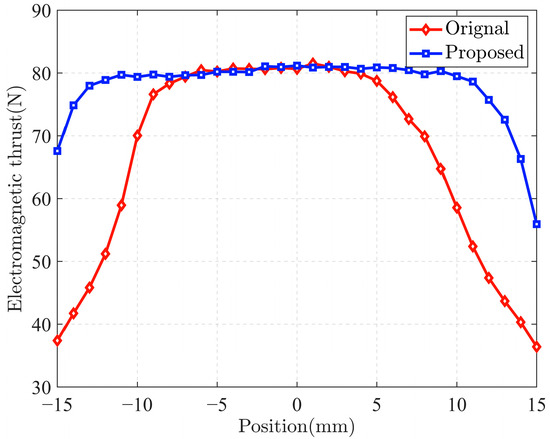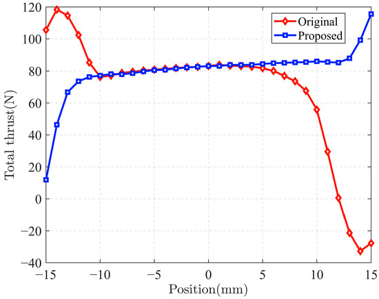 The thrust generated by the PMLOMs predominantly comprises magnetic reluctance thrust and electromagnetic thrust. A comparative analysis of magnetic reluctance thrust, electromagnetic thrust, and total thrust was conducted before and after the optimization process. Figure 12 illustrates the comparison of magnetic reluctance thrust in the prototype under no-load conditions, highlighting variations before and after optimization. The results indicate that the change in magnetic reluctance thrust at the midpoint remains minimal, whereas significant edge forces are observed at the extremities. Due to alterations in relative dimensions, the direction of the edge forces in the prototype reversed following optimization. Overall, magnetic reluctance thrust exhibits greater stability within the effective stroke of ±10 mm post-optimization, while the areas of abrupt edge forces shift further from the effective stroke range. Figure 13 presents the comparison of electromagnetic thrust in the prototype before and after optimization. The electromagnetic thrust is deduced by subtracting the simulated magnetic reluctance thrust under no-load conditions from the thrust recorded under load. The comparison reveals that the electromagnetic thrust diminishes on both sides before and after optimization, primarily due to a reduction in the main magnetic flux when the motor operates at the edge. After optimization, the stable region of the electromagnetic thrust significantly expanded, encompassing the effective stroke range. Figure 14 displays the comparison of the resultant load thrust of the motor before and after optimization, indicating that the thrust performance of the optimized prototype is superior within the effective stroke range. Table 4 provides a detailed comparison of thrust variations before and after optimization. Although the total thrust variation at the balance point is negligible, the average total thrust increases from 76.82 N to 80.34 N within the effective stroke range. Furthermore, following optimization, the thrust stability markedly improved, leading to substantial reductions in the fluctuation in both load electromagnetic thrust and total thrust, decreasing from 22.5 N to 1.75 N and from 21.28 N to 5 N, respectively.