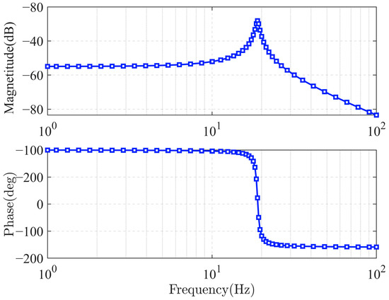 According to Equation (19), the impedance is minimized when , which corresponds to a mechanical resonance state where the imaginary part is zero. Consequently, the phase difference between current and speed is zero, implying that the phase difference between current and displacement is 90°. Figure 15 illustrates a Bode plot of the displacement and current transfer functions based on the optimized design parameters. This figure clearly shows that in the mechanical resonance state, the displacement produced by a unit current is maximized, and the phase difference between current and displacement remains at 90°, consistent with the derivation of the previously mentioned formulas.