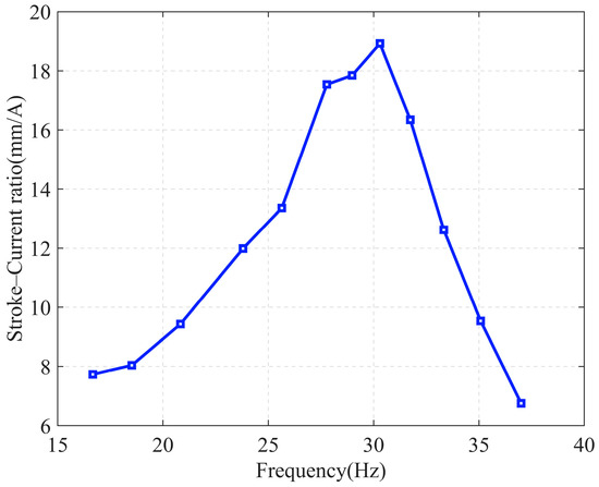 According to the parameter calculations in Table 6, the no-load resonance frequency of the motor is expected to be 30.1 Hz. Figure 17 and Figure 18 illustrate the relationships between the motor stroke–current ratio and the phase angle difference between the current and stroke as a function of frequency. Test data were obtained by supplying a fixed amplitude single-phase alternating current while varying the frequency to measure the motor stroke and the phase angle of the stroke–current. The results indicate that the actual no-load resonance frequency of the motor is approximately 30.5 Hz, at which point the phase angle difference between current and stroke is around 90°, and the stroke–current ratio is maximized. The two results differ by merely 0.4 Hz, resulting in a small calculation error of 1.3%.