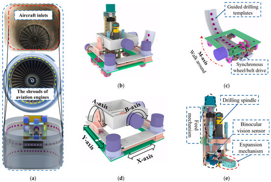 The robotic drilling system is designed to perform drilling tasks in confined and complex environments, particularly in aerospace applications. It is well-suited for aircraft manufacturing and maintenance, where conventional drilling equipment faces challenges in accessing narrow spaces, such as engine inlets and nacelles. Figure 1a illustrates a typical application scenario, where the robot is deployed in restricted working areas to carry out high-precision drilling operations.