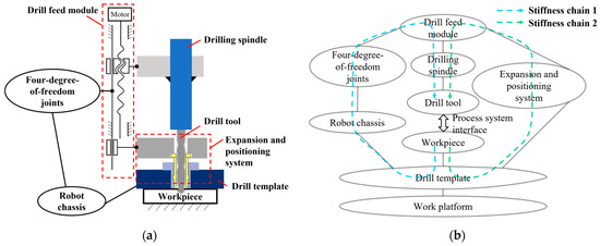 Schematic diagram and stiffness chain of the robotic drilling system: (a) schematic diagram; (b) stiffness chain.