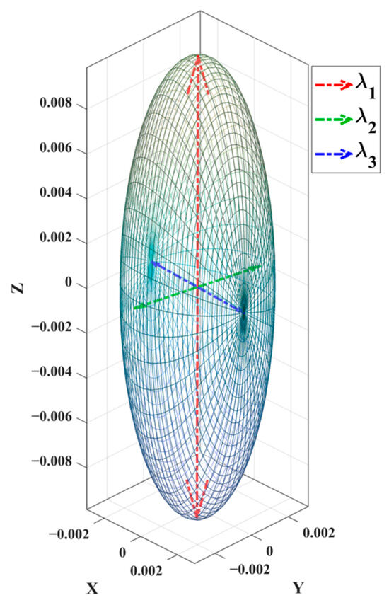 Substituting the system stiffness matrix into Equations (11)–(13) yields the corresponding displacement stiffness ellipsoid, as illustrated in Figure 3.
