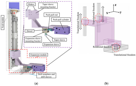 Figure 4a presents the structural diagram of the expanding positioning system, which exhibits a relatively complex architecture. The system primarily consists of an expanding sleeve, a conical sleeve, mounting brackets for both sleeves, push–pull cylinders, push–pull rods, pins, and sliders. During the drilling operation, the expanding sleeve at one end of the expanding positioning system extends and engages with the drill sleeve on the drill template, thereby constraining five degrees of freedom: translations along the X, Y, and Z axes, and rotations about the RX and RY axes. Conversely, the slider at the opposite end is connected to the end effector baseplate, restricting five degrees of freedom: translations along the X and Y axes, and rotations about the RX, RY, and RZ axes, as shown in Figure 4b.