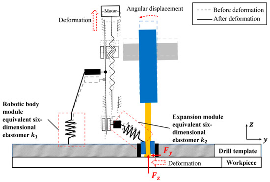 where is the system’s stiffness matrix, describing the structural resistance to deformation, is the deformation vector of the system resulting from the applied external forces, and denotes the external force matrix, encompassing the forces exerted on the end effector during the drilling process.