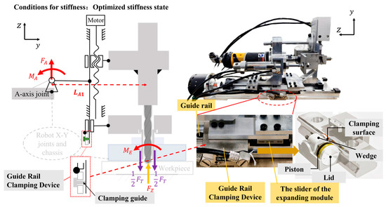 The optimization method proposed in this study employs a stiffness enhancement approach based on a localized closed-loop force flow at the end effector. This is achieved by integrating a guide rail clamping device into the existing expanding module, as depicted in Figure 6. Structurally, one end of the clamping module is mounted on the guide rail of the end effector baseplate, while the opposite end is connected to the slider of the expanding module via a connector. During the drilling process, the locking of the guide rail is controlled by an electromagnetic valve, allowing the locking force to be adjusted by varying the air pressure. These variations in locking force result in corresponding changes in stiffness along the Z-axis.