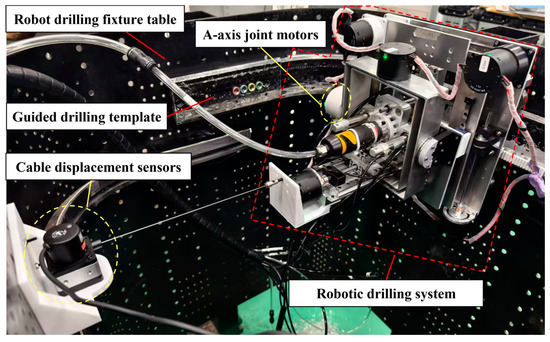 In the manufacturing sector, particularly within the aerospace industry where high precision is paramount, robots are widely utilized due to their flexibility, cost-effectiveness, and efficient performance in repetitive tasks [1]. Specifically, robotic technologies have demonstrated significant advantages in key machining processes, such as drilling [2,3,4], boring [5,6], milling [7,8,9], and grinding [10,11,12]. For instance, in the assembly of aircraft skins, drilling precision directly affects fatigue life, making the enhancement of machining accuracy a critical objective [13]. However, industrial robots, especially serial robots, are limited in their application to high-precision tasks due to their inherent low stiffness characteristics. Compared to traditional machine tools, these robots are more susceptible to deformation during the drilling process, thereby impacting machining accuracy and quality [14,15].