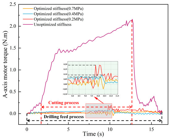 Figure 9 presents the A-axis torque output curves during the drilling process under different system stiffness states. It is evident that, without stiffness optimization, the maximum A-axis joint torque reaches , which is substantially higher than the torque value of achieved after stiffness optimization (under 0.7 MPa conditions). Furthermore, in the unoptimized stiffness state, the torque continuously increases during the drilling process, particularly during the initial tool entry phase, where the torque escalation rate surpasses that of the stable drilling stage.