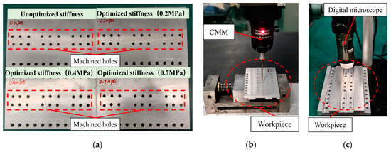 Figure 11a presents the aluminum alloy workpieces processed under four distinct robot stiffness conditions. A total of 72 holes were drilled (4 workpieces, each with 18 holes) using the same drill bit. The resulting hole diameter errors were measured with a coordinate measuring machine (Aberlink Axiom Too 15097, Aberlink, Eastcombe, Gloucestershire, UK), as depicted in Figure 11b. Furthermore, a digital microscope (AM7915MZT, Dino-Lite, New Taipei City, Taiwan) was employed to examine the exit burrs on the workpieces, as illustrated in Figure 11c.