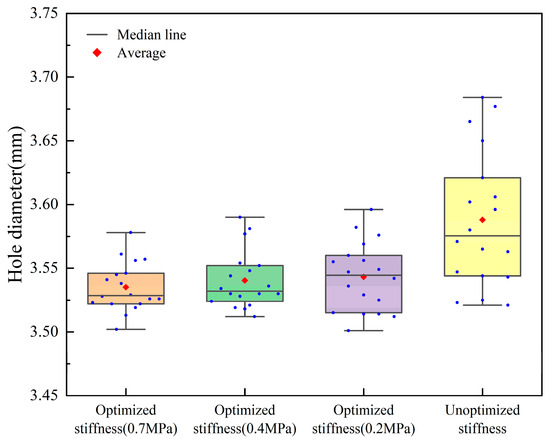 As shown in Figure 12, the hole diameter measurement results indicate that when the clamp operates at 0.7 MPa, the average hole diameter is 3.535 mm; at 0.4 MPa, the average hole diameter is 3.540 mm; at 0.2 MPa, the average hole diameter is 3.543 mm; and with the clamp disabled, the average hole diameter is 3.588 mm. The data indicate that hole diameter accuracy is higher under optimized stiffness conditions than in the un-optimized state. Furthermore, as clamping pressure increases, hole accuracy improves, and the hole diameter variation range becomes narrower. Strengthening the axial stiffness improves both the hole diameter accuracy and its stability, primarily for the following reasons: