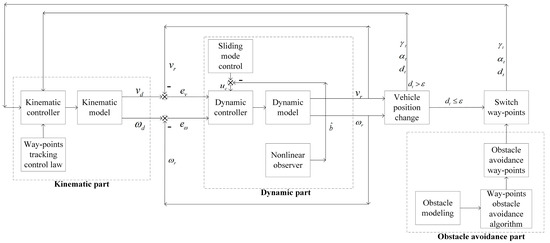 The organization of this paper is as follows. Section 2 describes the problem and introduces the control objects. Section 3 establishes the vehicle kinematic model and designs the kinematic controller. Section 4 describes the establishment of the dynamic model and the sliding mode control with observer. Section 5 presents the way-point obstacle-avoidance algorithm. Section 6 presents the system way-point tracking control algorithm. Section 7 presents the simulation experiment and analysis, and Section 8 presents the conclusion.
