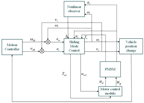 where denotes the angular velocity of the motor, represents the damping coefficient, and accounts for uncertain factors. In addition, in order to simplify the problem, only the angular velocity after the motor transfer of the trolley is considered, and the mechanical equation of the velocity and angular velocity of the vehicle can be obtained by the formula of the change of angular velocity and velocity.