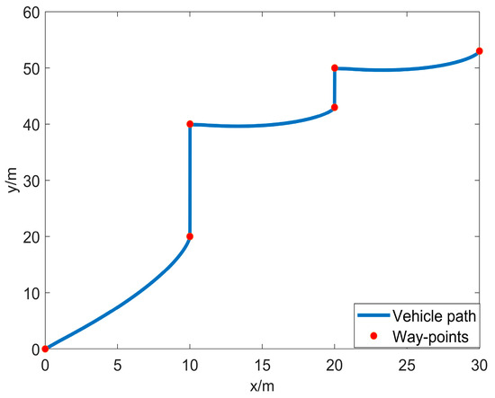 First, set the way-points as , and define the error tolerance as 0.1. The parameters used are the same as those in the single-point simulation. As shown in Figure 7, the vehicle tracks the target points with stable accuracy, completing the way-point tracking as set, and successfully follows the specified coordinate points.