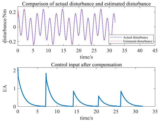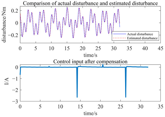 Figure 10 and Figure 11 are the simulation images of the observer of the forward motor and the rotating motor, which contain the estimated image of the uncertain disturbance and the control input after the compensation image, respectively.
