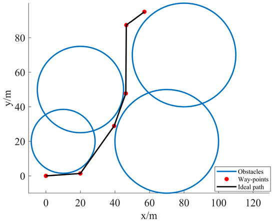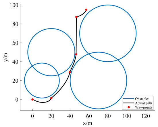 In this subsection, the obstacle-avoidance algorithm simulation is carried out. In this algorithm, the starting point of the car is set to , and the destination is set to . The algorithm generates a path between these two points, guiding the car to navigate around obstacles. In the simulation, the obstacles are modeled as circles with the following parameters: a center at and radius 18.5, a center at and radius 25, a center at and radius 30, and a center at and radius 30.