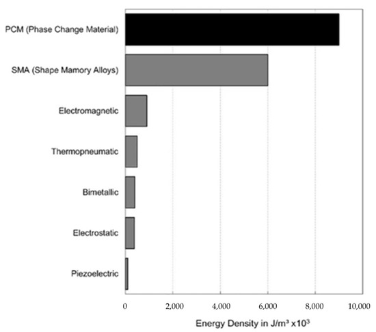 PCM actuators are one such solution. These actuators, powered solely by temperature changes, use phase change materials (PCMs) to generate actuation through volume changes during the phase change process [1]. The key advantage of PCM actuators lies in their ability to produce displacement and torque with minimal mechanical impact and the ability to reset after actuation. Due to the inherent stability of PCMs and their low supercooling behavior, PCM actuators offer reliable, repeatable performance. Studies have shown that compared to other actuator materials—such as shape memory alloy, electromagnetic, thermopneumatic, bimetallic, electrostatic, and piezoelectric actuators—PCMs exhibit the highest energy density (Figure 1).