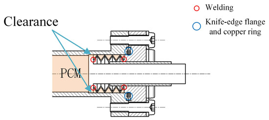 A 0.1 mm gap exists between the piston and the housing (Figure 3), allowing the PCM to flow between the CMH and the cavity. To ensure a proper seal, welding is used between the CMH and the shell. At the opposite end of the piston, the PCM is sealed using a similar knife-edge flange and copper ring configuration.