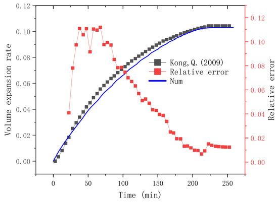 The discretized algebraic equations are solved using the Full Newton iteration method, with a convergence criterion set to 0.005. The software performs implicit computations, and the grid model used for the simulation is CAX4T. This type of grid model typically refers to a 4-node, 3D, thermally coupled element used in finite element analysis (FEA), often employed to simulate thermal and structural behaviors in materials and systems. Material properties and the experimental model are based on the real model from Q. Kong [19]. To assess the validity of the numerical model, we calculated the volume expansion rate of the PCM and compared the results with the experimental data from Q. Kong [19]. The comparison, shown in Figure 6, demonstrates strong agreement between the two models. The maximum relative error is 11.1%, indicating a favorable level of consistency between the numerical and experimental results.