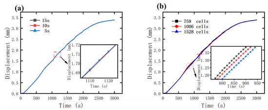 To determine the appropriate time step and accurately predict the phase change time, three different time steps (5 s, 10 s, and 15 s) were evaluated. As shown in Figure 8a, the displacements remained almost unchanged for time steps below 10 s, with the mean relative error less than 0.01%. Based on this, a time step of 10 s was selected for further analysis.