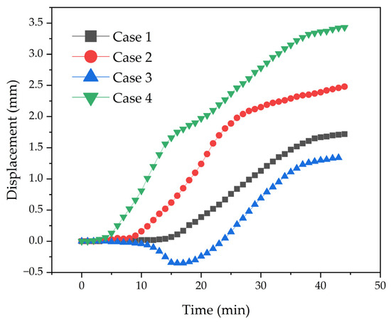 As illustrated in Case 1 (Figure 10), during the 0–13 min interval, the actuator’s displacement remains limited to a maximum of 0.03 mm. In this stage, the PCM has not yet begun the phase-change process. The output displacement results from the thermal expansion of the PCM, but due to the minimal temperature change, the volume change is also insignificant.