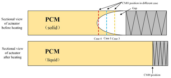 As shown in Figure 5, the volume of the PCM varies with temperature. Within the actuator structure, the PCM is enclosed and subjected to pressure due to the CMH. Given the extended phase change time of the PCM, the flow of the liquid phase is not considered in this analysis.