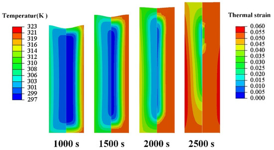 The temperature and thermal strain of the PCM inside the actuator are shown in Figure 13. The temperature at the top of the PCM is lower than at the bottom due to the inhomogeneous volume change in the PCM. During the phase-change process, observed at times 1000 s, 1500 s, and 2000 s in the figures, the changes in thermal strain closely follow the temperature changes. At 2500 s, the PCM has nearly completed the phase change, and the thermal strain changes become smaller. Due to the poor thermal conductivity of the PCM, the temperature distribution within the material is not uniform.