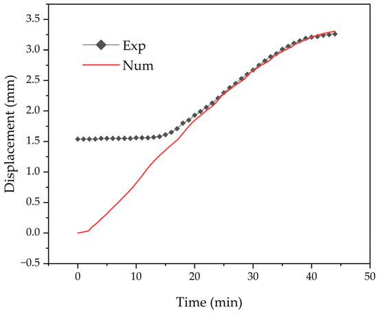 From 39 to 44 min, the rate of displacement output decelerates, increasing slightly from 1.65 mm to 1.72 mm. By this point, the PCM has completed its phase change, and further displacement is minimal.