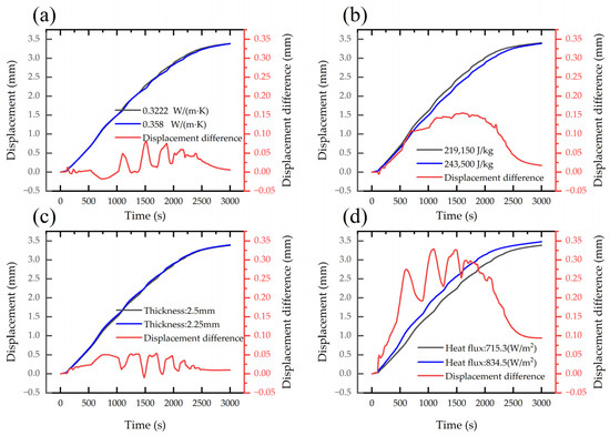 Displacement output results after 10% parameter change. (a) k, (b) L, (c) δw, and (d) heat flux.