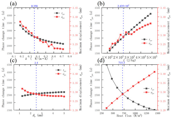 In practical applications, enhancing the thermal conductivity of PCM, reducing the latent heat of phase change, and increasing surface heat flux can all improve the actuator’s reaction rate. Therefore, prioritizing the optimization of these factors—maximizing thermal conductivity, minimizing latent heat, and increasing surface heat flux—will enhance performance. However, it is important to recognize that as these factors change, their impact on the PCM actuator gradually decreases. In real applications, the extent of these changes should be considered in relation to the operating environment and production costs.