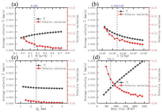 Results of the average velocity and velocity variation for the 0.5× to 2.0× parameters. (a) k, (b) L, (c) δw, and (d) heat flux.