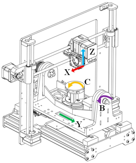 Bohez [16] classified five-axis machine tools into four categories, according to the number of translation (T) axes and rotation (R) axes: (i) three T axes and two R axes, (ii) two T axes and three R axes, (iii) one T axis and four R axes, and (iv) five R axes. Lee et al. [17] classified five-degree-of-freedom manufacturing devices into three types: the table-tilting type, the spindle-tilting type, and the table–spindle-tilting type. In a table-tilting five-axis AM device, the additional rotational motion is provided to the printing platform instead of the print head, which can maintain the gravitational acceleration of the print head and make sure that the printing consumables remain in the same direction, thereby facilitating the deposition of materials when printing parts [18]. Therefore, this paper uses a table-tilting five-axis AM device with three moving axes and two rotation axes. In addition, the five-axis AM device can eliminate the need for a support structure by adjusting the direction of the printing platform, and can correctly print parts with overhanging features without the need for support structures.