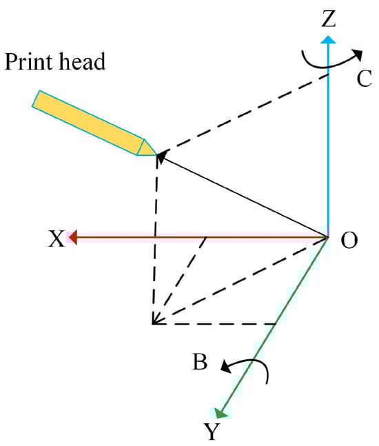 To facilitate printing, the print head can be aligned with the axis of the printing platform before printing, and . The inverse operation of Equations (9) and (14) can be solved to obtain the values of each axis, as shown in Equations (15) to (19):