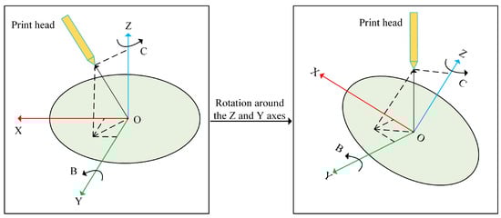 To use a five-axis AM device for support-free printing, solving the inverse kinematics problem is essential. During the process of support-free printing, the five-axis AM device will adjust the angle of the rotation axis () at any time to control the tilt and rotation of the printing platform. The position of the printing head is affected by the values of the rotation axis () and the feed axis (), and the position of the printing head depends only on the value of the rotation axis [19]. The coordinate system conversion relationship before and after the change in regard to the printing platform is shown in Figure 3.