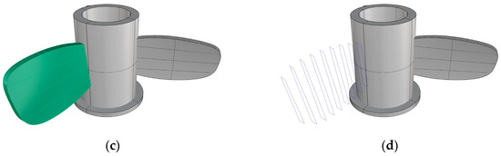 The overhanging parts will only be printed after the base part has been printed. The outer surface of the basic part is extracted and offset in the direction of the part to be printed, according to a certain layer thickness . The number of surface offsets is . The offset surfaces are intersected with the part to be printed to obtain an intersection curve, which is represented by the layered curve set . The layered surface set is defined as . As shown in Figure 5, taking the propeller model as an example, a surface layering operation is performed on it, and the extracted layered curve is shown in Figure 5d.