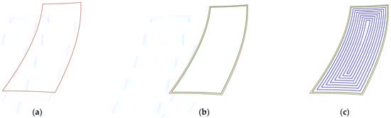 The layering algorithm, based on surface offsetting, can extract the layering curve set of each layer of the part to be printed. As shown in Figure 6a, the initial layering curve is selected as the basic curve for the initial outer contour curve and the initial inner filling curve offset (only one curve is selected). Because the line width of the extruded material must be taken into account, the actual printed outer contour must be offset toward the filling area. The resulting initial outer contour curve is shown in Figure 6b. Commonly used 3D printing processes are divided into path-based continuous filling and on-demand array filling, according to the filling method [24]. In order to reduce the invalid movement of the nozzle to realize the continuous printing of the infilled area, the contour offset method is used for path planning. The initial inner filling curve is shown in Figure 6c.