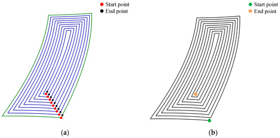 The obtained initial inner filling curve cannot be used directly as a printing path. The starting points and end points of two adjacent curves need to be connected to each other to form a complete continuous path filling curve. In Figure 7a, the starting point and end point of the outer contour curve and the inner filling curve are shown. Assuming that each curve has m segmentation points and there are c () curves in total, to obtain a complete continuous path filling curve, as shown in Figure 7b, the steps are as follows: