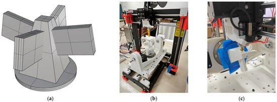 The manufacturing process for the propeller part is shown in Figure 13. Figure 13a–c shows the manufacturing process for the first, second, and third blades of the propeller part, respectively. Thanks to the five-axis support-free AM method, the process of printing this part does not require additional printing of the part used to support the overhanging structure, so there is no need for post-processing operations to remove the support structure. A comparison with the traditional three-axis AM method of the printing time and filament length of the whole part created using the five-axis AM method are shown in Table 4. The printing time and filament length are reduced by 26.93% and 29.29%, respectively, which means that it saves materials, while improving the manufacturing efficiency.