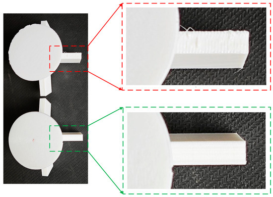 The part shown in Figure 9a was printed using the support-free five-axis AM method. The slicing and print parameters are shown in Table 2. A comparison with the traditional three-axis AM method (which used a smaller support filling rate of 15%) is shown in Table 3 in regard to the printing time and length of filament used for the part produced using the support-free five-axis AM method. It can be seen that compared with the three-axis AM method, the time required for printing the part using the support-free five-axis AM method is reduced by 13.76%, and the length of filament used is reduced by 17.24%. Therefore, the use of the five-axis support-free AM method to print the overhanging part improves the manufacturing efficiency, while reducing the printing cost.