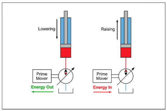 The standard solution to this problem is to use a hydraulic loading system, which is controlled by a servo- or proportional valve. This creates a very energy-intensive system. During the loading phase, some hydraulic power is lost in the control valve, which must always have a pressure drop across it to maintain authority over the loading actuator’s motion. Nevertheless, when the strain energy in the structure is released, the entirety of it is converted into heat. For large, stiff, structures, which must be tested for many millions of cycles, this represents a vast amount of wasted energy. If a load-sensing pump control is used, then some improvement is possible, seeing as the pressure drop across the valve is kept relatively constant, as shown by Scopesi [19] and Manring [20].