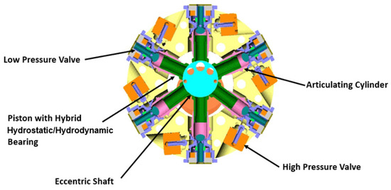 The digital displacement pump or DDP was initially conceived at the University of Edinburgh and then subsequently developed by Artemis Intelligent Power Ltd., now Danfoss Scotland [21]. Its core mechanism could be any positive displacement machine with individual working chambers of varying volume. The DDP cross-section presented in Figure 2 highlights the basic elements of the pump.