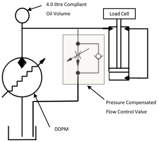 A simplified schematic of the hydraulic loading system, consisting of an oil reservoir, a DDPM unit, an adjustable pressure compensated flow control valve, a loading jack, and a load cell.