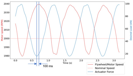 Traces of both the flywheel speed and the desired load acting on the specimen specimen deflection showing the energy exchange, both in amplitude and phase. The two vertical lines represent the phase shift, showing the maximum flywheel speed to be slightly leading to the minimum displacement.