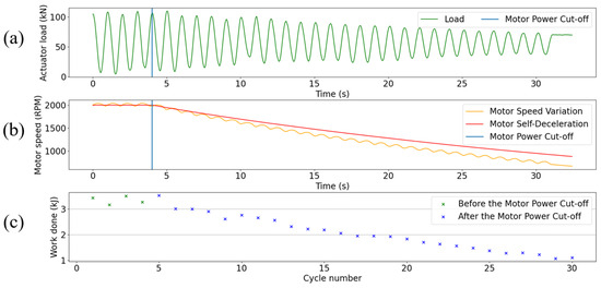 The drive signal to the DDPM continued as before, with the amplitude of the loading decreasing cycle by cycle. Figure 8a shows the load trace continuing for 25 cycles beyond the motor switch off. Figure 8b shows the corresponding rotation speed of the DDPM in two different loading conditions, the first where cyclic loading of the specimen continues, and the second where the DDPM valve actuation is stopped. Finally, Figure 8c displays the energy transferred during each cycle, which can be seen above at 3 kJ at the start of the test, decreasing to 1 kJ after 25 loading cycles.
