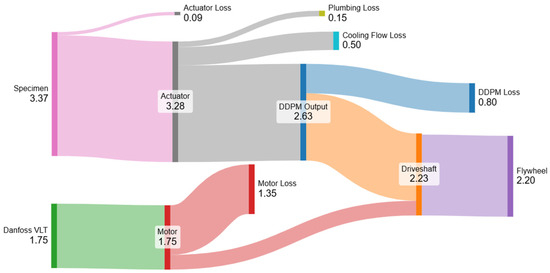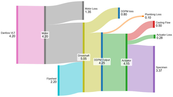 The energy balance of the unloading phase (Figure 11) of the cycle is similar to that of the loading one. Essentially, the same amount of energy is exchanged between the flywheel and the test specimen, but the direction is reversed. The motor is driven with a relatively small amount of energy from the VLT during the unloading, again with very poor efficiency due to the extreme part load. The losses of the DDPM, hydraulic circuit, and actuator are assumed to be the same as in the loading portion. The motor loss is also assumed to be the same as that during the loading phase, though with the knowledge that this will not be quite correct as, during unloading, the motor is producing half of the energy that it does during the loading phase. It is difficult to split the motor losses into two separate phases, given the dominating effect of the standing parasitic effects discussed earlier, so the simple expedient of apportioning half to each one is used.