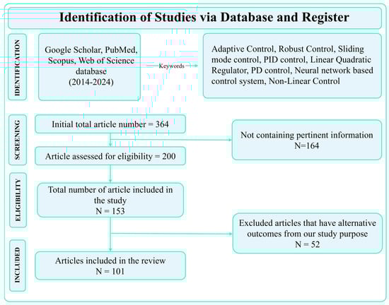 A systematic search was conducted using several electronic databases, including PubMed, IEEE Xplore, Scopus, and Web of Science. The search terms included combinations of keywords such as “computed torque control”, “exoskeleton”, “robot-assisted rehabilitation”, “computed torque control”, “Robust Control”, “Sliding mode control”, and “Linear Control”. The search was limited to articles published in peer-reviewed journals and conference proceedings between 2014 and 2024. To ensure thorough coverage, both backward and forward citation tracking of selected articles was performed.