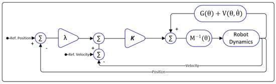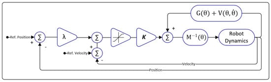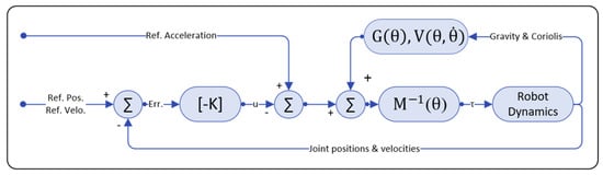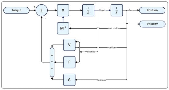 As shown in Figure 2, the torque needed to move a robotic manipulator is distributed among several factors. These include link acceleration , compensation for gravitational forces (G(θ)), counteraction of Coriolis and centrifugal forces , and friction at mechanical joints. Dynamic models facilitate the decomposition of these elements, enabling linearization and the development of linear control systems based on the simplified model.