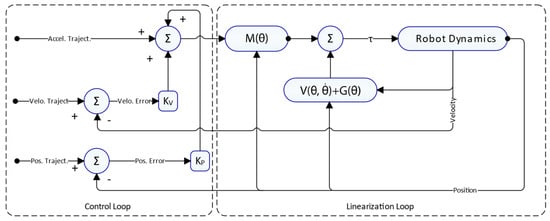 The architecture of a CTC system is shown in Figure 3. CTC consists of two loops. The linearization loop removes nonlinear effects caused by gravity, Coriolis, and centrifugal forces. The control loop provides the input needed to achieve the desired performance while maintaining system stability.